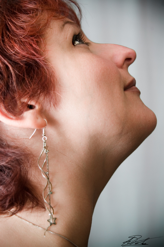 Trovo però che proprio il taglio limiti le potenzialità espressive dello scatto con un’inquadratura un pò troppo stretta in alto e a destra sul disegno del profilo. C’è una forte tensione espressiva in quel guardare verso l’alto, ..in quel tendere il collo con la testa all’indietro e andava lasciato più spazio di fronte al viso per ....”raccoglierne” proprio la dinamica espressiva.