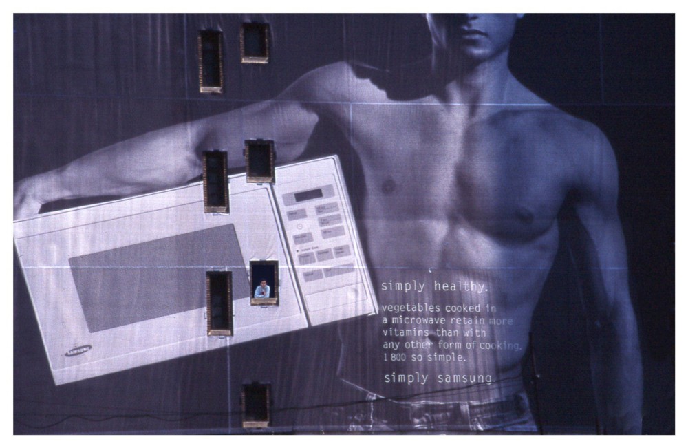 Un palazzo in ristrutturazione a New York, una facciata interamente ricoperta dalla pubblicità, un uomo affacciato alla sua finestra.