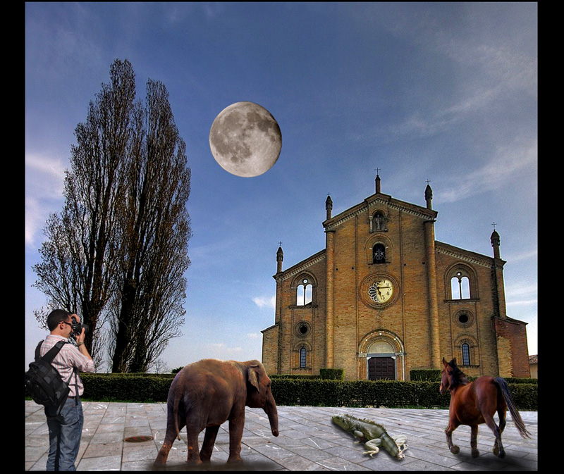 una bella elaborazione fabius, simpatica e soprattutto non facile. quello che mi disturba maggiormente è la luna dai bordi troppo netti, proverei ad aggiungere un bagliore diffuso sia per dare l'dea della luce riflessa sia per ridurre lo stacco tra cielo e corpo celeste.