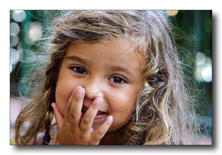 L’inquadratura è stretta, ..strettissima sul viso della piccola, quasi a volersi concentrare sulla spontanea espressività di quegli occhi scuri e carichi di luce e di quella gestualità che svela lo stupore di un sorriso spontaneo.