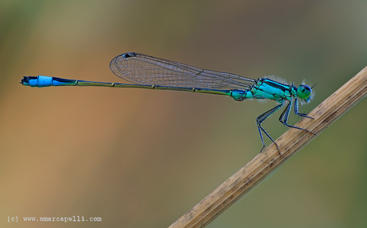 Buona la maf sulla damigella. Composizione originale nella quale la linea del posatoio e quella dell'addome del soggetto portano al centro d'interesse dell'immagine : l'occhio. E' pur vero che in foto di questo tipo le regole compositive possono non essere seguite alla lettera, ma se lo sono ben vengano. Vedo, nello stacco tra il posatoio e lo sfondo, una linea più marcata di colore verde-azzurro forse proveniente dalla compressione nella trasformazione in jpg, particolare cmq di scarsa rilevanza.