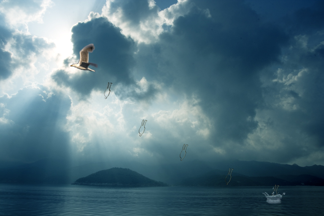 Bella l'idea però il gabbiano risulta troppo "aggiunto in post", proverei a sfumare i bordi per renderli meno netti.