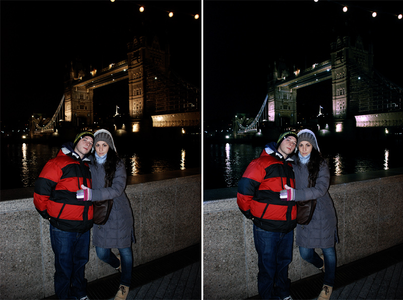 Il classico: ci fai una foto con lo sfondo del Tower Bridge? Al buio e controluce far uscire ben esposte le persone e il ponte è praticamente impossibile. Il flash è un buon alleato ma inevitabilmente il ponte viene giallognolo. E' qui che diventa davvero utile il photoshop e il suo bilanciamente colore usato selettivamente. Lo scatto è una semplice foto ricordo, ma mi sembrava potesse essere utile a chi sta imparando a usare il programma ^_^