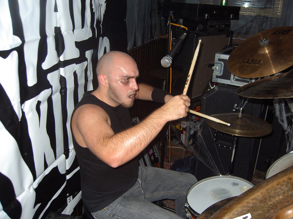 Siamo sempre sudati e con espressioni improbabili quando ci agitiamo dietro i tamburi (sono anch'io un batterista rock), ma quando vestiamo i panni del fotografo dobbiamo fare i conti con la luce... e qui (colpa del flash) è piatta ed ha congelato i movimenti del musicista.