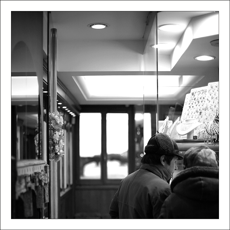 Un chiarimento d'obbligo. La vetrina è di un negozio che è sul Ponte Vecchio; il ponte che si dovrebbe indovinare oltre la finestra è il ponte di Santa Trinita.