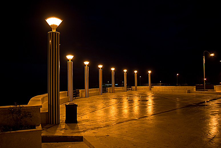 Un'ottima composizione notturna, bella la composizione creata dalla fila dei lampioni. Certo che una pavimentazione così lucida è un attentato all'incolumità pubblica.