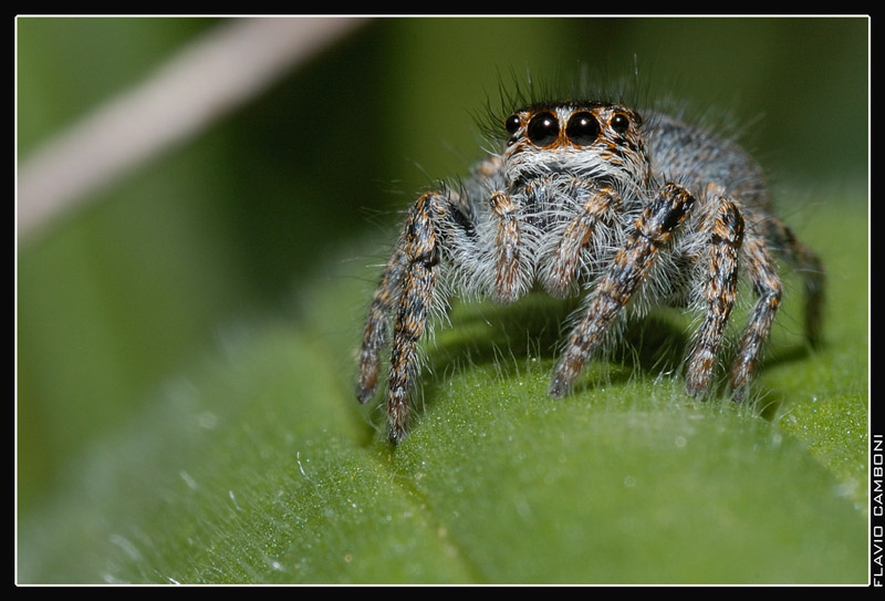 Buona la maf selettiva sugli occhi del soggetto, buoni anche i colori del ragno in contrapposizione con il verde del posatoio. Trovo che la linea chiara in alto a sx e lo sfocato in primo piano in basso a dx siano elementi di disturbo.