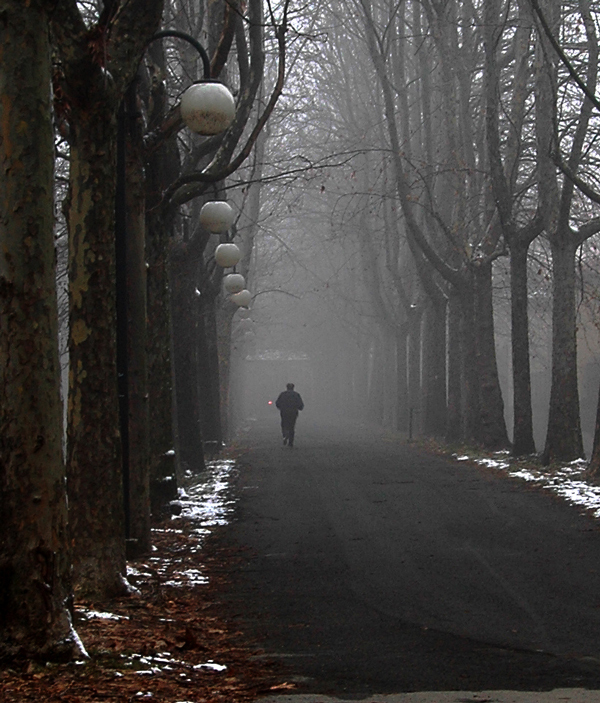 Stesso commento di iw9fy: molto suggestiva. Come possibili variazioni sul tema, vedrei bene un taglio sulla parte bassa portandosi a formato quadrato (si dà più importanza alla parte 'nebbia', la parte della nostalgia della poesia e del mistero, eliminando le parti vicine, della certezza e della prosa, che pesano un po' troppo. Forse sono pazzo...),. E, in questo caso senza tagli, portarla del tutto in bianco e nero, e forse ammorbidire i contrasti, sempre per privilegiare il seno di irrealtà suggerito dalla nebbia e smentito dal colore sia pur leggerissimo delle foglie morte. Non dare retta, vaneggio.