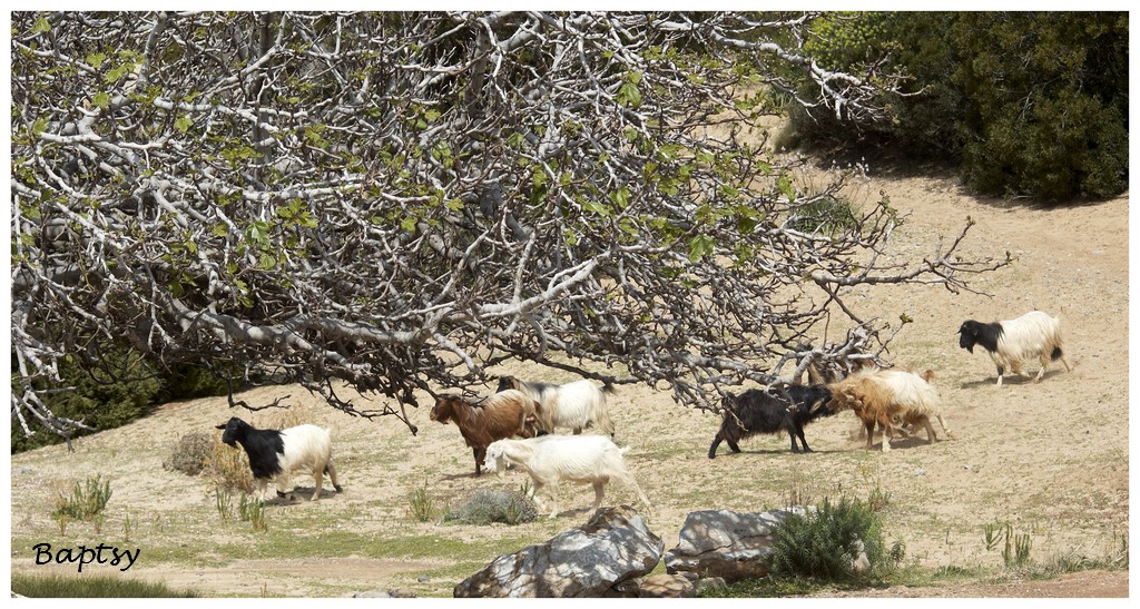 La nitidezza è carente. Il fuoco sembra cadere tra i rami in primo piano dell'albero. Tra l'altro conveniva scattare da più in basso per evitare che i rami in questione coprissero in gran parte le capre