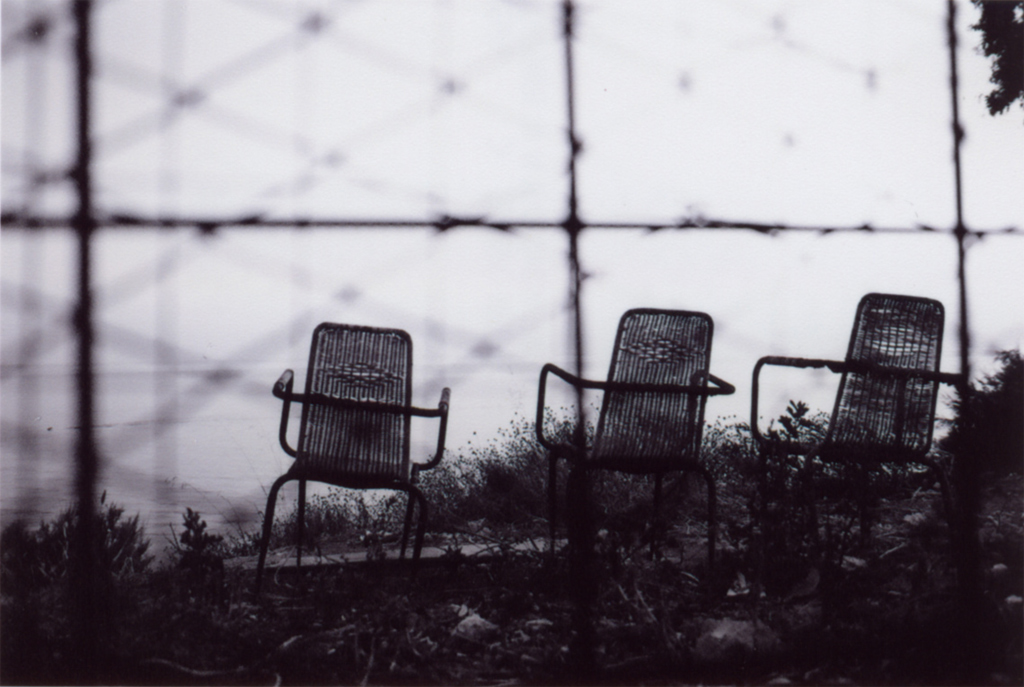 Le tre seggiole vuote dietro il filo spinato (o rete, fa lo stesso) rimandano a un senso di abbandono, di solitudine molto forte. Mi sembra uno 'sguardo oltre' pieno di dolore e mancanza, almeno io la vedo così. La mancanza di nitidezza deriva dalla scansione o era così anche stampata?