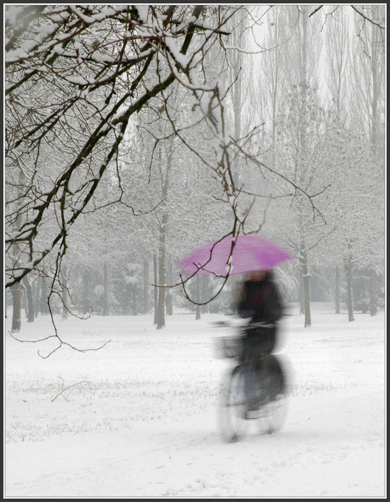 Anch'io dico: peccato per il ramo che copre parzialmente la ciclista. A parte questo mi sembra davvero un ottimo scatto valorizzato in maniera evidente dal colore dell'ombrello e dal mosso, perfetto in questa circostanza.