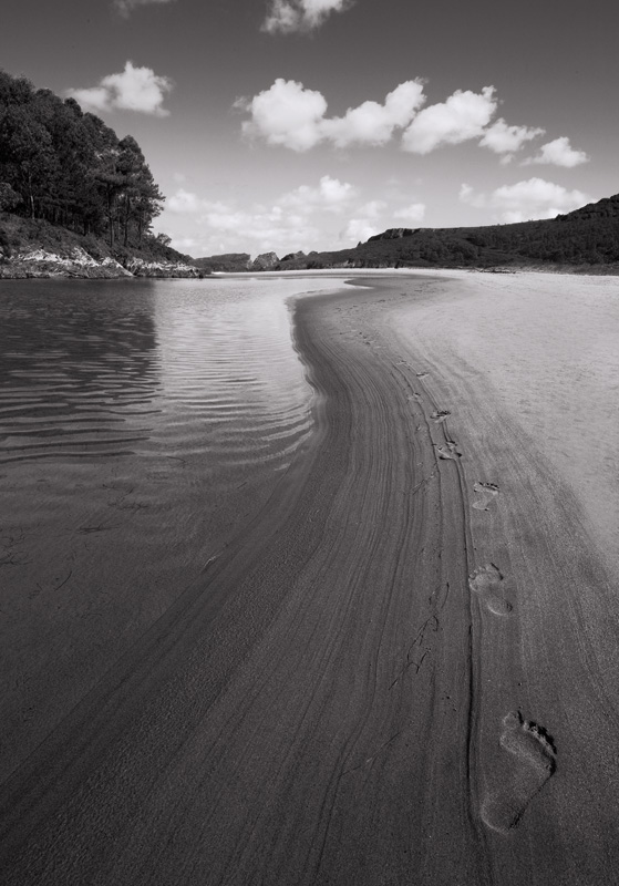 Piacevole gestione prospettica, gustoso l'andamento curvilineo di quella linea di sabbia umida solcata da una serie stranamente ordinata di orme umane, l'una dietro l'altra, ad evidenziare il percorso sinuoso che pervade tutta la foto. Avrei forse preferito un riflesso meno imponente sull'acqua, ma più che altro un cielo meno digradante e più scuro, incisivo, come usando un filtro rosso. Un altro paio di scelte diverse si sarebbero potute fare in merito al taglio della nuvoletta in alto, e alla collocazione del limite inferiore del bagnasciuga (che tuttavia trovo piacevolmente non banale, mentre facile sarebbe stato cedere alla tentazione di piazzarlo esattamente nell'angolo inferiore sinistro del fotogramma). Paesaggio semplice e quasi fiabesco, di cui colpisce innanzitutto la "perfezione" di per sé, valorizzata poi da un'attenta scelta delle variabili fotografiche. Bianco e nero gradevole, piacevole la "tricromia" acqua - sabbia bagnata - sabbia asciutta, graduale e intensa, dà una sensazione di luminosità e pace che armonizza ulteriormente la scena. Sembra, pur senza conoscere il posto, uno di quei bianco e nero che non dovrebbero far "rimpiangere" il colore nemmeno ad un paesaggista colorista convinto.