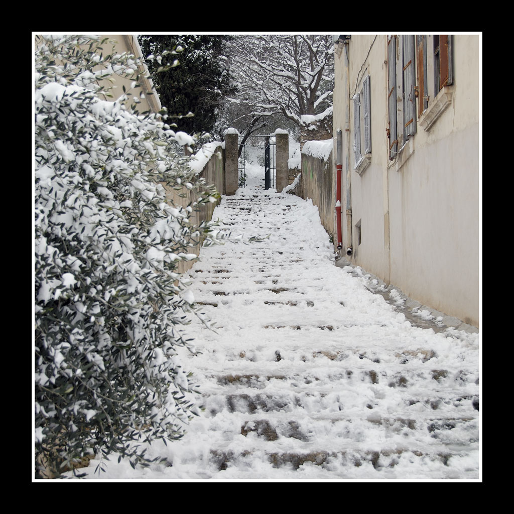 Un po' statica, un po' fuori fuoco i primi gradini e il cespuglio.