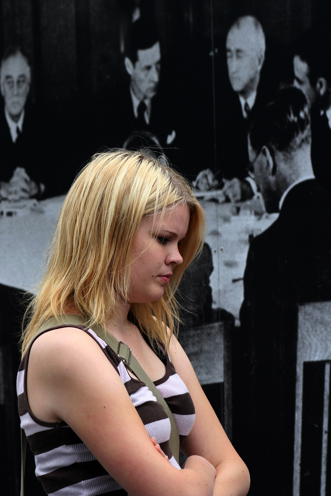 Si, davanti alla storia, ma la ragazza non sembra nemmeno accorgersene. Purtroppo questa è la sintesi dei nostri tempi. La storia passa e noi non sappiamo capirne le lezioni.  |