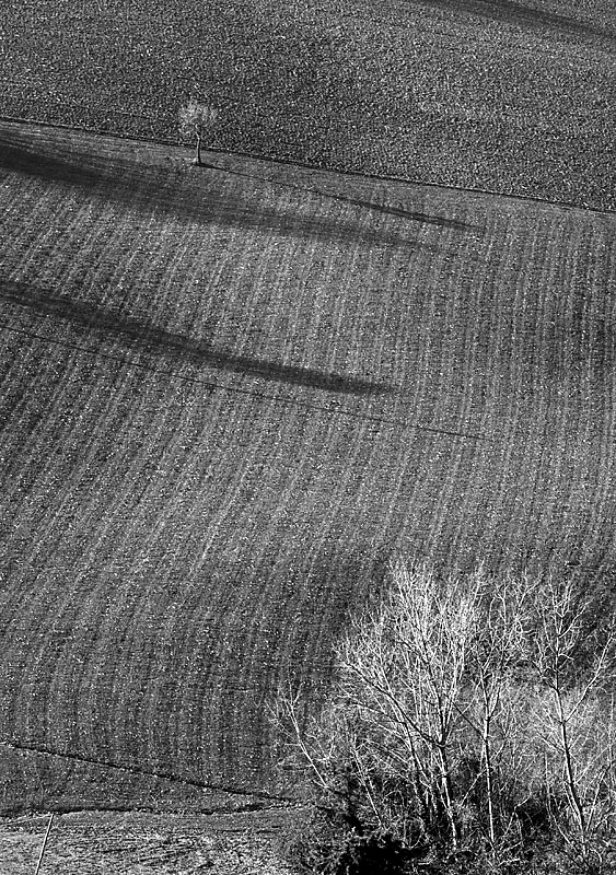 ....l'intuizione mi pare davvero buona ma valuterei una composizione più pulita, meno elementi nel fotogramma affinché il grafismo ottenuto dalla luce radente presente al momento dello scatto unita al terreno particolare in contrapposizione ad un elemento morbido e sinuoso come un'albero possano generare un'immagine immediata e dal giusto "contrasto" oggettivo/emotivo ...... da valutare molto attentamente anche la conversione in B&W in modo che toni differenti a colori non diventino troppo simili in B&W...