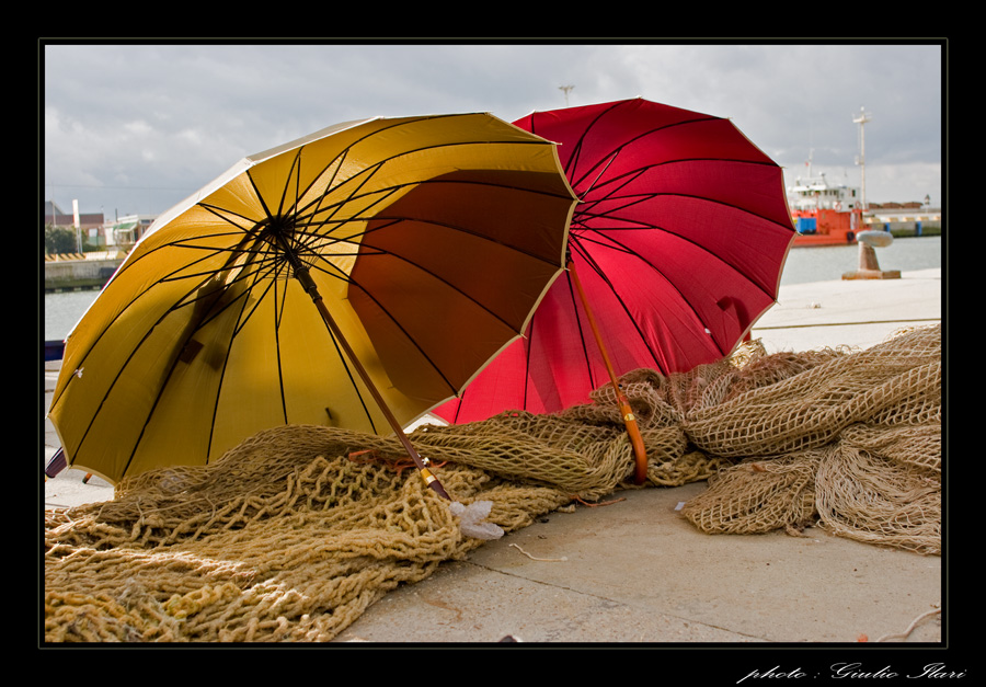è uno scatto fatto al volo, gli ombrelli erano gli ultimi due di una serie esposta da un vucumprà che appena mi ha visto imbracciare la macchinetta si è stranito.