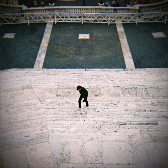 Forse disturba un po' l'aver incluso nell'inquadratura tutti quei dettagli in alto, oltre le transenne: rimanere su un ambito pressoché piano, avrebbe connotato maggiormente la foto di un carattere astratto, conferendo maggiore estensione agli spazi, e quindi isolamento all'uomo che sale. Complice la scarsa nitidezza, la vignettatura - specie in basso - è un po' spiacevole.
