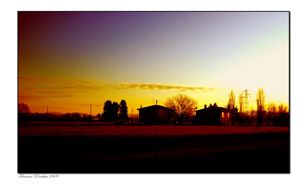 ...i toni appaiono molto contrastati, il rosso quasi bruciato.... un'effetto che tende ad aumentare la sensazione già offerta dal tramonto,ma decisamente esasperata... un po troppa la porzione nera usata come piede dell'immagine