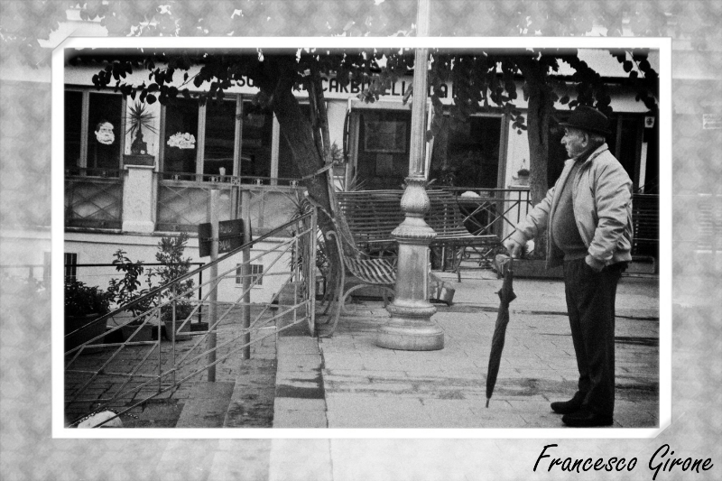 La cornice è carina ma un po' troppo invadente, il piede dell'uomo è un po' troppo vicino al bordo, il palo è storto... La conversione al BN mi piace, e la foto trasmette sensazioni di pace ed è rilassante... Complessivamente bella, peccato solo per quei due o tre particolari che si potevano sistemare