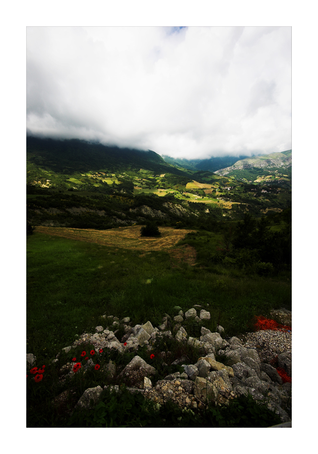 Avrei brutalmente tagliato sopra e sotto (da dove comincia il rosso di papaveri/recinzione) per un formato quadrato, mi sembra che concentri più l'attenzione sullo squarcio di luce. Non schiarirei sotto, il rosso e il bianco delle pietre già attirano l'occhio. La quercia purtroppo ha la cima confusa dalla vegetazione soprastante, e data la distanza di ripresa sembra più un cespuglio...