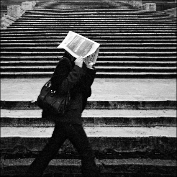 Oltre agli angoli formati dalle gambe e dal giornale ne vedo altri che delimitano le scale. Non so se ho compreso il messaggio. Essenziale ed efficace.