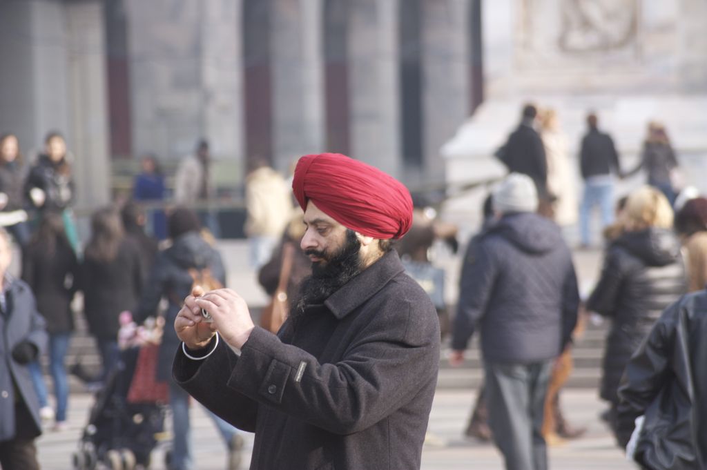 Cosa ti colpiva? Il simpatico copricapo del soggetto, nonchè l'effetto a contrasto che il suo colore ha sull'intera scena? In effetti la cosa può essere meritevole, magari però, rendere più partecipe il luogo aiutava la scena a farla funzionare. In piazza duomo a Milano, incontrare un soggetto particolare è fin troppo facile, studiare un pò il comportamento della gente e il loro modo d'interagire, ti permetteva di anticipare qualche azione più meritevole...