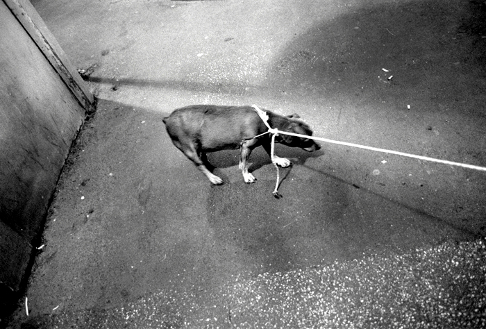 in questa foto, quella corda tesa (non un bel guinzaglio di cuoio e un collare colla targhetta luccicante, come per tutti i cani a cui si tiene, ma guardate bene: c'è un laccio che stringe dolorosamente la zampa) mi fa vedere chi lo tira, so che è incurante verso la bestia. nello scatto non c'è ma io completo la scena di quello che non vedo. è successo e succede tutt'ora all'uomo di venire trattato così (e peggio), quindi, metaforicamente, quel cane è l'uomo.