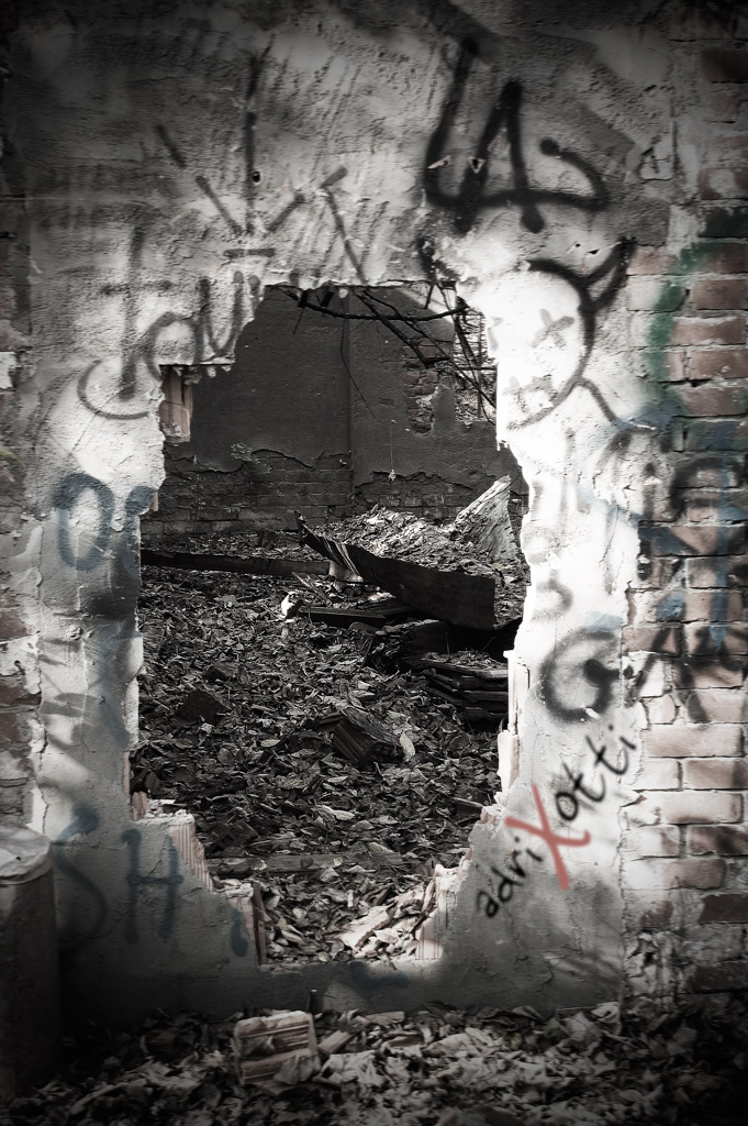 avrei scurito il muro in pp, oppure (in alternativa) avrei inquadrato solo l'interno, e "cercato" la foto lì dentro: scorgo forme e toni a mio avviso più fotogenici del muro con le scritte, anche se sarebbe tutt'altra foto!
