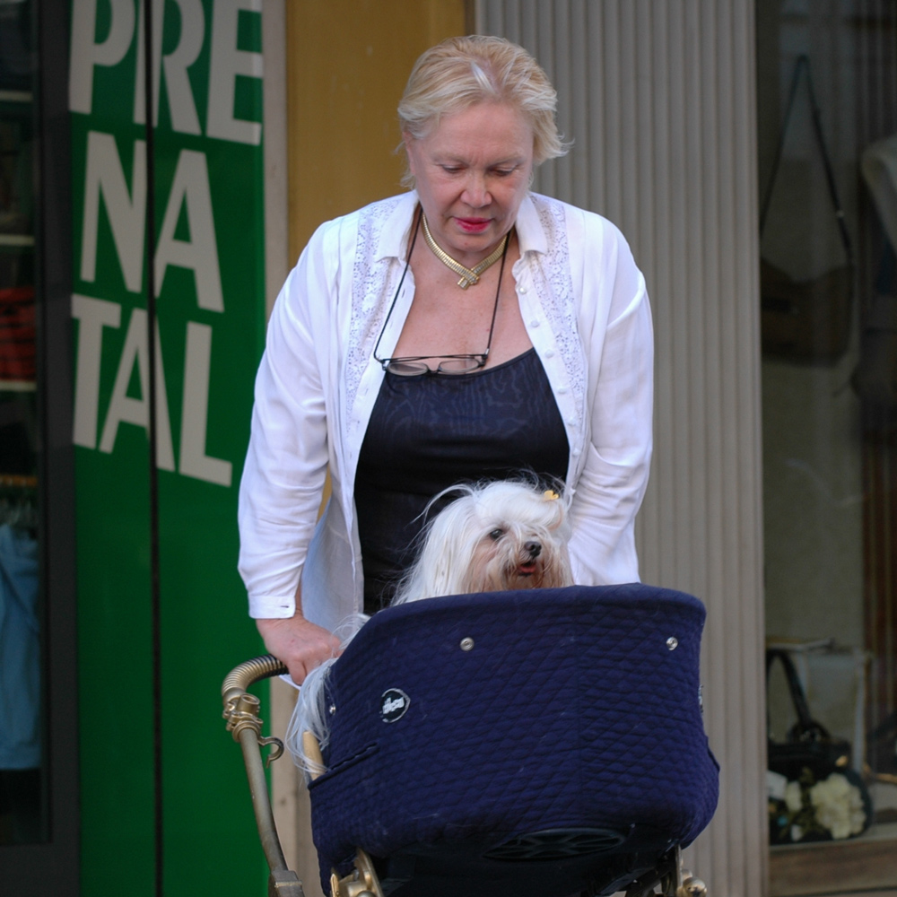 mi sarebbe piaciuto se avessi ripreso per intero (e decentrato) la signora con il passeggino, così la testolina del cane che sbuca diventava ancor più