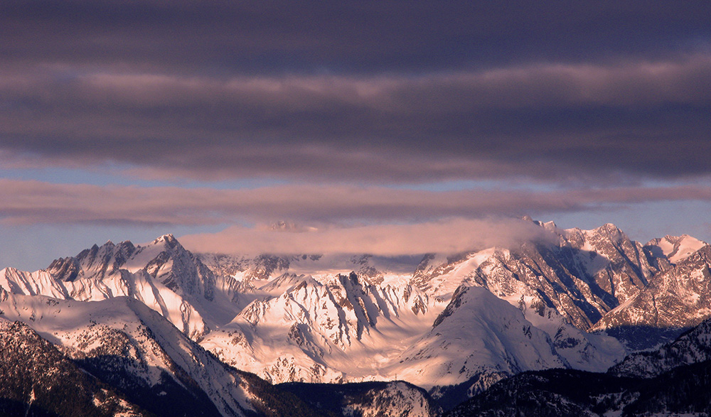 Una bella veduta montana,con dei bei toni rosati,nell'ora del tramonto