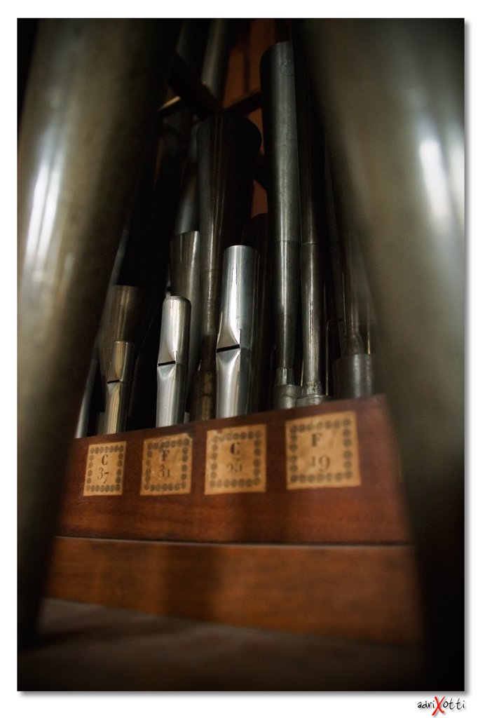 Oggetto, anzi soggetto molto affascinante il somiere e le sue canne. Peccato che questa foto non renda giustizia alla complessità costruttiva ed estetica di questo strumento, impresa che reputo anche molto ardua visti spazi e luce che normalmente si hanno "dietro la facciata"