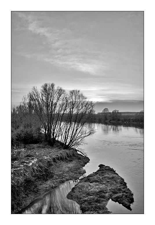Non capita certo tutti i giorni di vedere un tramonto in BN, in questo caso direi che il tramonto ha un aspetto molto marginale mentre il vero protagonista è il fiume che dalla scelta del bianconero sembra uscire vincitore e regge agilmente il peso di tutta la scena.