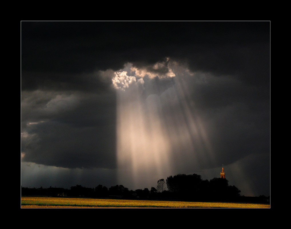 Questo terreno giallo ocra in contrapposizione con le nuvole nere non lasciano altro sentimento che la Speranza possibile solo nella Fede, per chi crede naturalmente, possibile solo in quello sqarcio di Luce che sembra l'occhio di Dio...