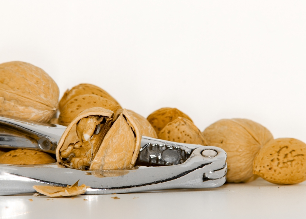 Scatto interessante ma di difficile realizzazione per la presenza di due, se non tre, materiali che riflettono la luce in modo diverso (schiaccianoci, tavolo e noci). Per evitare il problema delle superfici riflettenti è necessario scegliere la giusta forma della sorgente luminosa. Una lampada quadrata o rettangolare che mandi un fascio di luce di una tonalità uniforme consente di ridurre al minimo i riflessi. La lampada deve essere supportata da un adeguato diffusore.