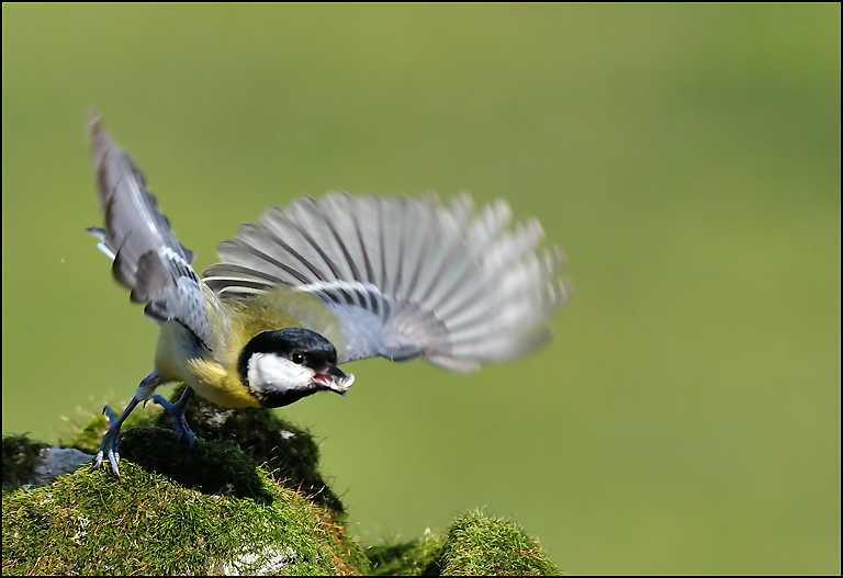 Un plauso per averla scattata mentre la cinciallegra spiccava il volo cosi da poterla ammirare in tutto il suo splendore. Bellissimo lo sfondo.