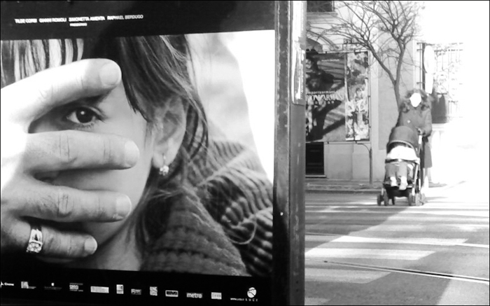 Ottimo l'accostamento con il cartellone: la mano davanti agli occhi sembra alludere a questo " vedo, non vedo"; ma al tempo stesso la scena di destra ne esalta la drammaticità