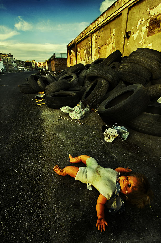 Una foto del genere, vedendola in un reportage e vedendola più concentrata sulla bambola, risalterebbe probabilmente di più, spiccherebbe incuriosendo senza per questo esaurire precocemente "quello che ha da dire". Per capire cosa intendo per "stuzzicare", puoi prendere ad esempio "Il furto della sciabola, Leopoldville" di Lebeck, e vedere come ciò che rappresenta sia completamente diverso (e questo non ci interessa) ma come la scena rappresentata sia in qualche modo più "ricca", più variegata, meno univoca e predefinita. La tua è più vicina al paesaggio "disumano" di "Viaggio da nord a sud" di Chargesheimer, perfetta nel rappresentare ciò che rappresenta ma forse un po' autolimitata dal voler rappresentare proprio quello.