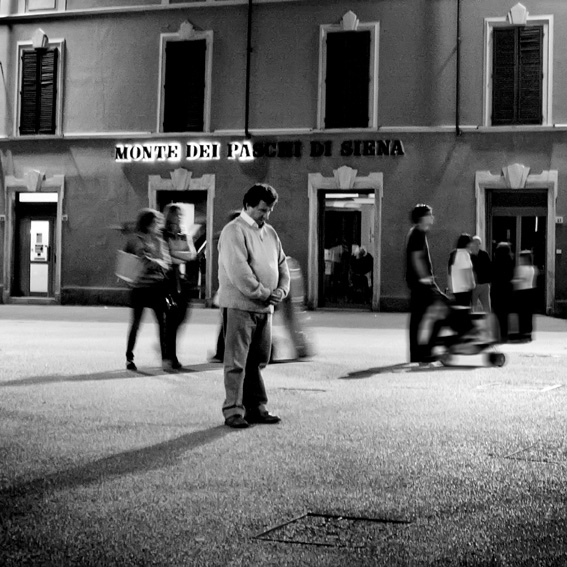 Buono l'attimo colto: l'uomo si ferma proprio dove si interrompe l'illuminazione della scritta, mentre il resto del mondo, le persone , continuano a muoversi. Ottimo il capo chino: mi ricorda la posa che assumono i robot nei cartoni animaiti o nei film di fantascienza quando vengono spenti o disattivati.