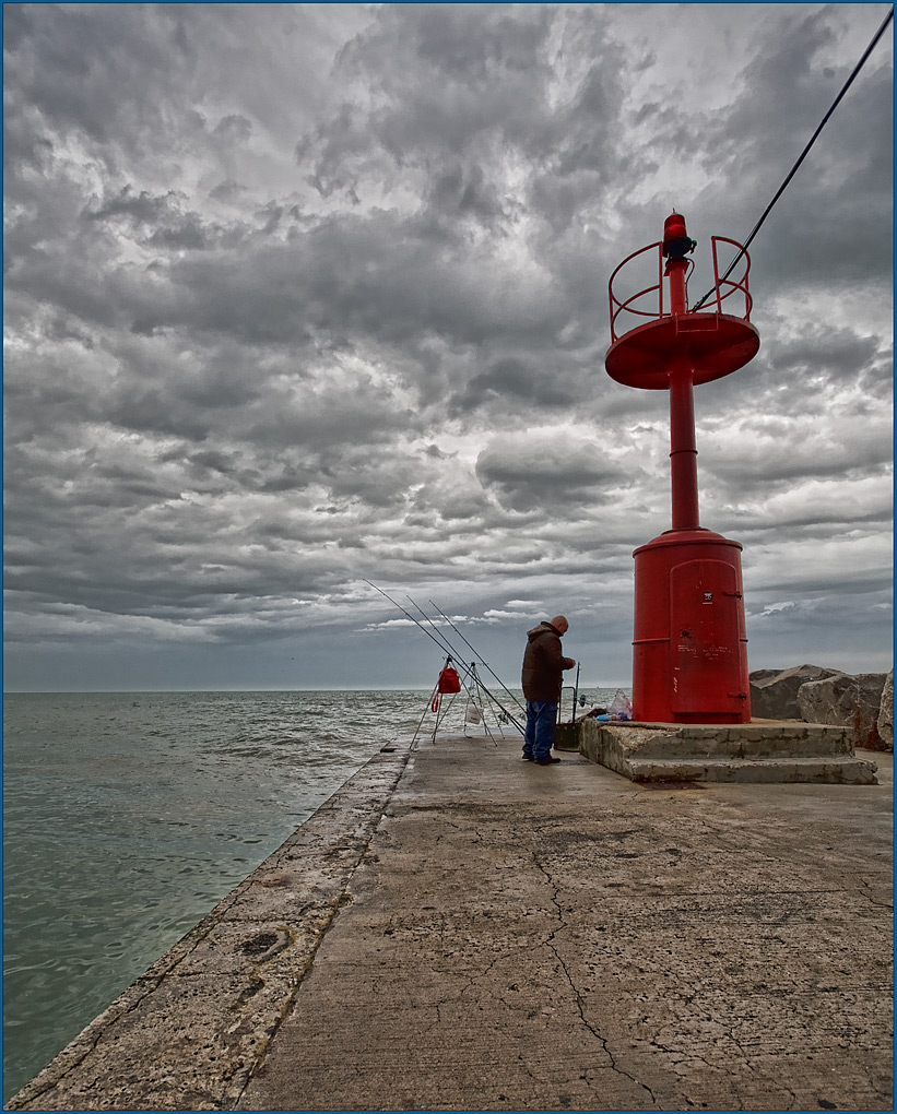 ,............. ma uno che pesca doveva forse ballare, oppure gli dovevo chiedere se si metteva in posa, io su un molo ho visto sempre gente che pesca o passeggia, c'era una bella luce e nuvole e hoscattato una foto senza pretese non è che dovevo fare un' opera d' arte.