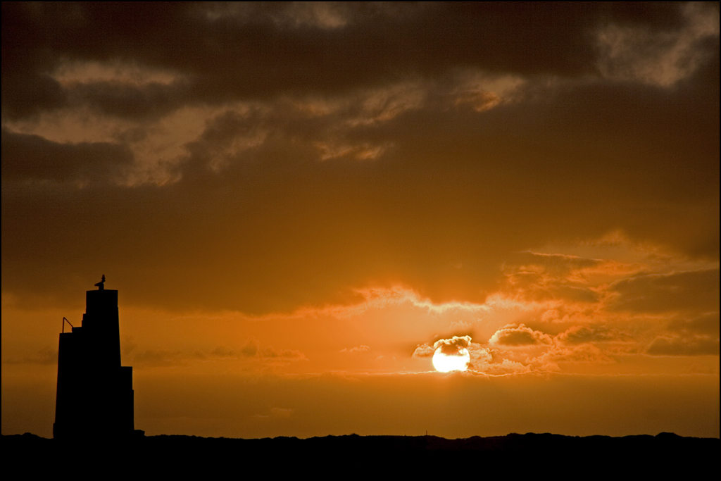 l'occhio del tramonto, bello il monocromatismo di questa immagine, incornicato dalla silouette nera di faro e rocce.