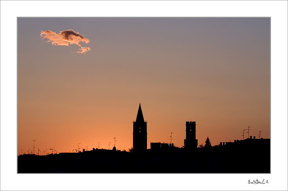 perfetta nell'andamento compositivo la silhuette del borgo, immersa in un bel tramonto e sul quale veglia la solitaria nuvoletta.