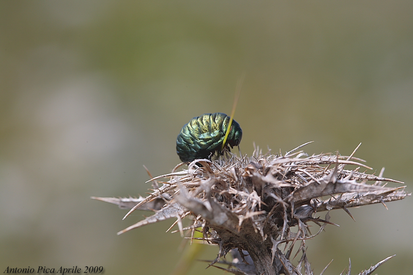 Piace l'accostamento tra le rotondità del soggetto e il puntuto accartocciarsi del posatoio. Piace anche il bel digradare dei toni sullo sfondo che pare riprendere e mediare tra il metallico verde del bestiolone e il secco e ruvido marroncino del posatoio!