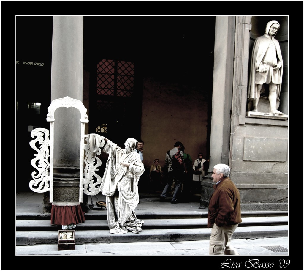 ho tagliato in questo modo proprio per mettere in evidenza (nei due angoli) da un lato l'artista di strada che sta finendo di abbigliarsi dall'altro, in contrapposizione, la statua di Giotto nella sua staticità.