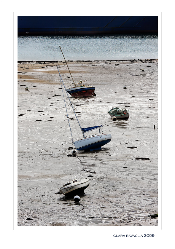 la mareea a quelle latitudine e' impressionante, sembrano che riposano piu' che adagiate sul fango, la composizione oltre che interessante, poteva essere ottima se non ci fosse la pilotina di destra che non e' adagiata sul medesimo lato, ed il fondo in alto che sembra una nave di grossa stazza, che disturba un po', sicuramente ne hai altre con altre prospettive migliori.. cmq un bel terzetto...