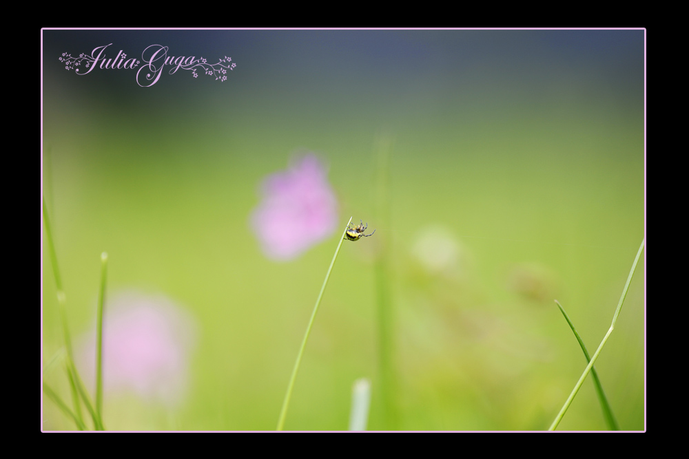 Credo, con un taglio verticale avresti potuto inserire i fiori sfumati come tuo desiderio, oltre a comporre meglio il ragnetto all'interno dell'immagine.