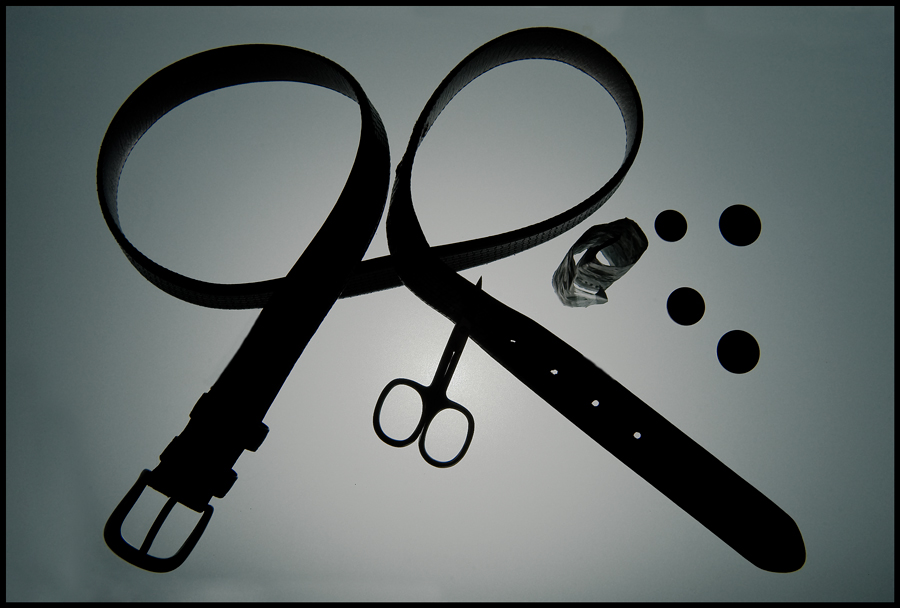 Grazie bossolo, quasi tutto giusto, quelli che credi bottoni sono monete, (si vedrebbero i buchini..) le forbicine servono proprio a creare un nuovo buco alla cintura che il "periodaccio" ha reso necessario. Si, un tavolo di vetro, flash sotto a creare la silhouette.