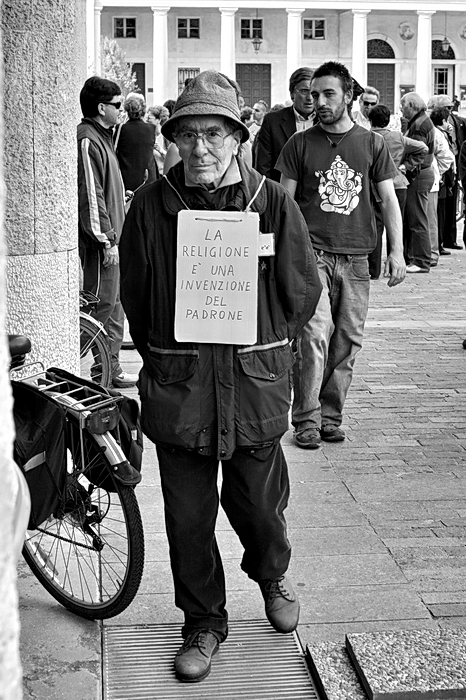 a volte cmq porta cartelli parecchio più grandi,sia addosso che su un asta a mo di bandiere,è un soggetto decisamente bizzarro che oramai fa parte dell'arredamento urbano di reggio emilia,cmq tutti i suoi cartelli sono a senso unico nella condanna più decisa della chiesa e della religione,e a volte riportano messaggi politici talmente di sinistra da far sembrare Ferrero e Diliberto due esponenti di forza nuova