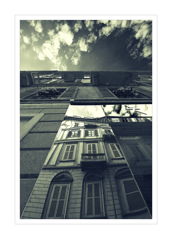 come accennato, sono tornato ora che ho un po' più di calma a commentare questo scatto.. che è una incredibile quanto mai assoluta dimostrazione di come scovare architetture e riprese particolari anche dove queste due cose non ci sono.. sfruttare il riflesso in questa ampia superficie vetrata ti ha dato la possibilità di creare un'architettura diversa e quanto mai non reale, ma che vive e si sviluppa sullo e nello stesso riflesso, completata dal senso di vertigine e di sviluppo vertiginoso verso l'alto.. bellissimo sia uno che l'altro viraggio.. il cielo ti ha dato un contributo fondamentale nell'atmosfera finale..