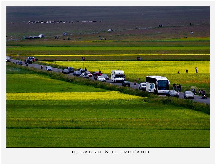Prima pensavo si trattasse di una situazione che qui da me si presenta sovente: una vasta zona tra Modena e Carpi viene utilizzata periodicamente per ' apparizioni ' della Madonna di Fatima (credo)..e si formano esattamente le stesse catene umane e di auto e camper.( da qui ' sacro e profano' )