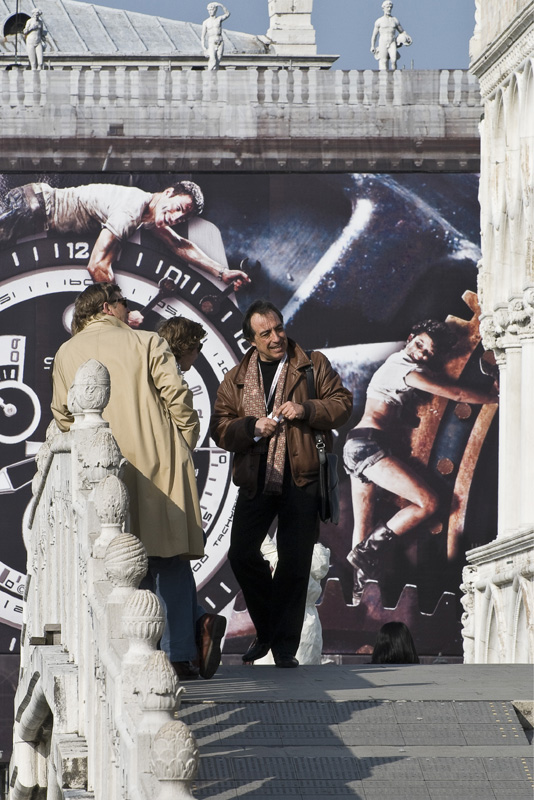Sei stato veramente bravo considerando la situazione complessa e così ricca di elementi che ti apprestavi a fotografare. Coinvolgente tutta la scena con i personaggi del manifesto che sembrano interagire con le persone reali. L'unica cosa che trovo fuori posto è quella testa scura sul lato destro.